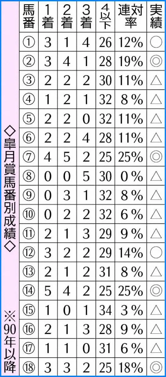 フルゲートが18頭立てになった90年以降、馬番別成績は14番が最多5勝。過去10年では7番が【2・3・1・4】とコンスタントに好走しており、そのうち1桁人気だった6頭は全て馬券に絡んでいる。